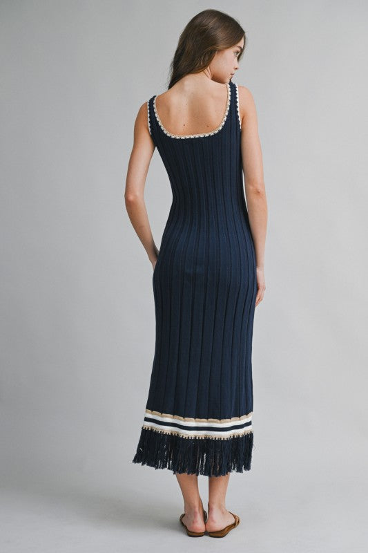 Embrace effortless elegance with the St. Barths Knit Dress. Crafted from breathable knit fabric, it offers comfortable stretch for all-day wear. The stunning navy blue hue and gorgeous crochet neckline details elevate your style, while the striped hem with playful fringe adds a touch of fun. It's a must-have for any wardrobe!